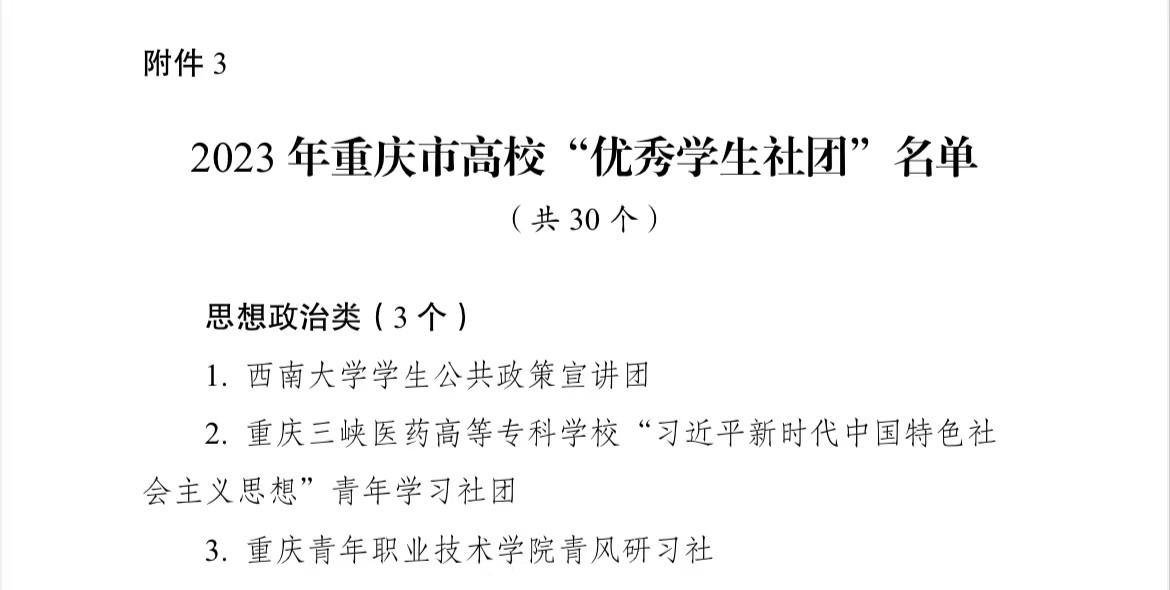 发布时间: 2023-12-25 10:38:50 已阅读:12月18日,由团市委、市委教育工委,市教委、市学联联合开展的2023年重庆市高校“一校一社一品”优秀学生社团及项目品牌培育建设工作评审结果公布,学院学生公共政策宣讲团(以下简称“公宣团”)荣获“优秀学生社团”称号。