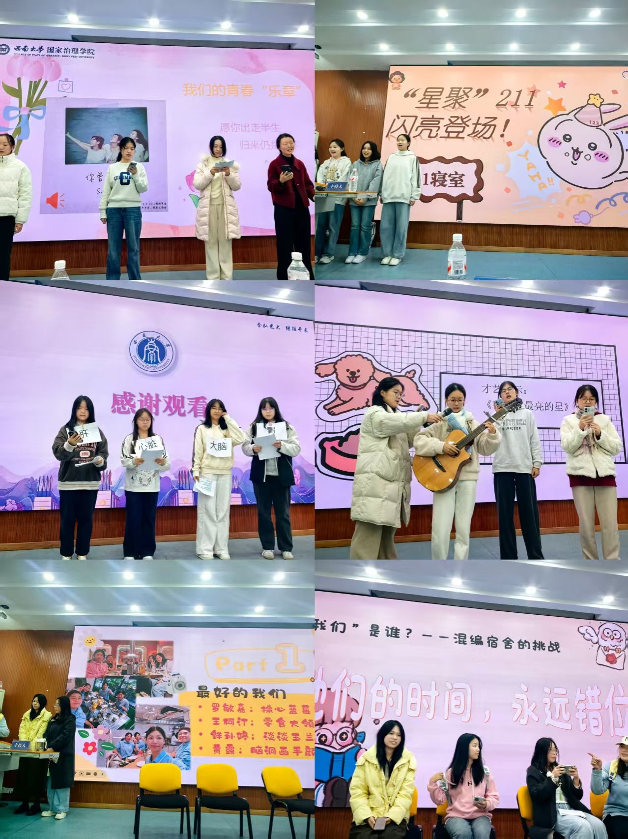 决赛伊始,各参赛寝室依次登台进行风采展示。参赛寝室成员分别从寝室介绍、室名室徽解读、成员风采和才艺展示四个板块,生动呈现了属于他们的“寓”见风华。七个寝室展现出七种独特风格:既有饱含诗意与温暖的室名如“星耀211”“嘉木怡园”,也有由成员Q版形象设计而成的创意室徽,既有宛转悠扬的合唱《夜空中最亮的星》,也有源于真实生活的小品演绎。每个展示都凝结了寝室生活的美好点滴,带领在场师生沉浸式走进和谐温馨的寝室家园,充分彰显了国治学子饱满昂扬的精神面貌与乐观向上的生活态度。