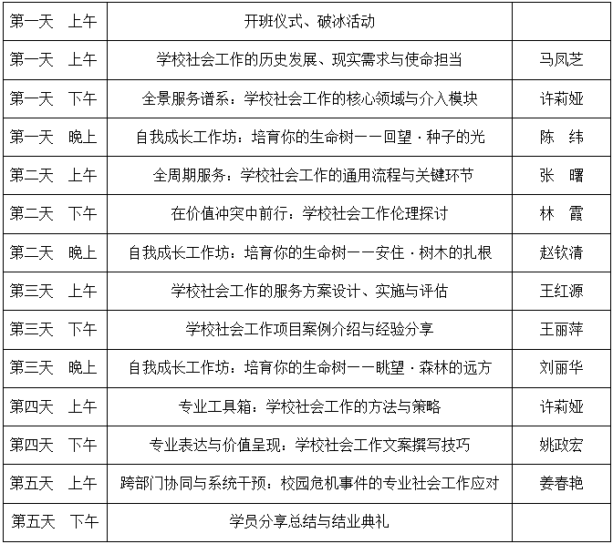 (一)夯实理论基础:帮助学员系统掌握学校社会工作核心理论、方法及政策法规,明晰专业定位与价值理念。